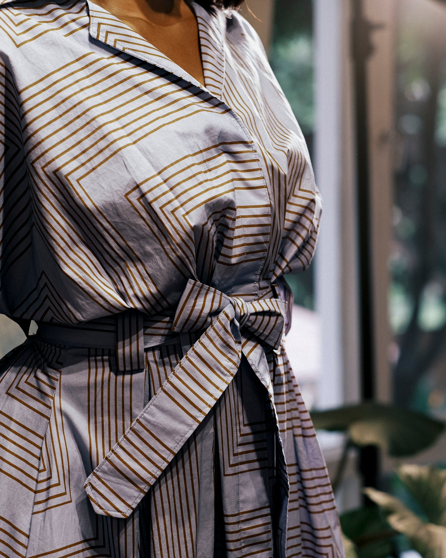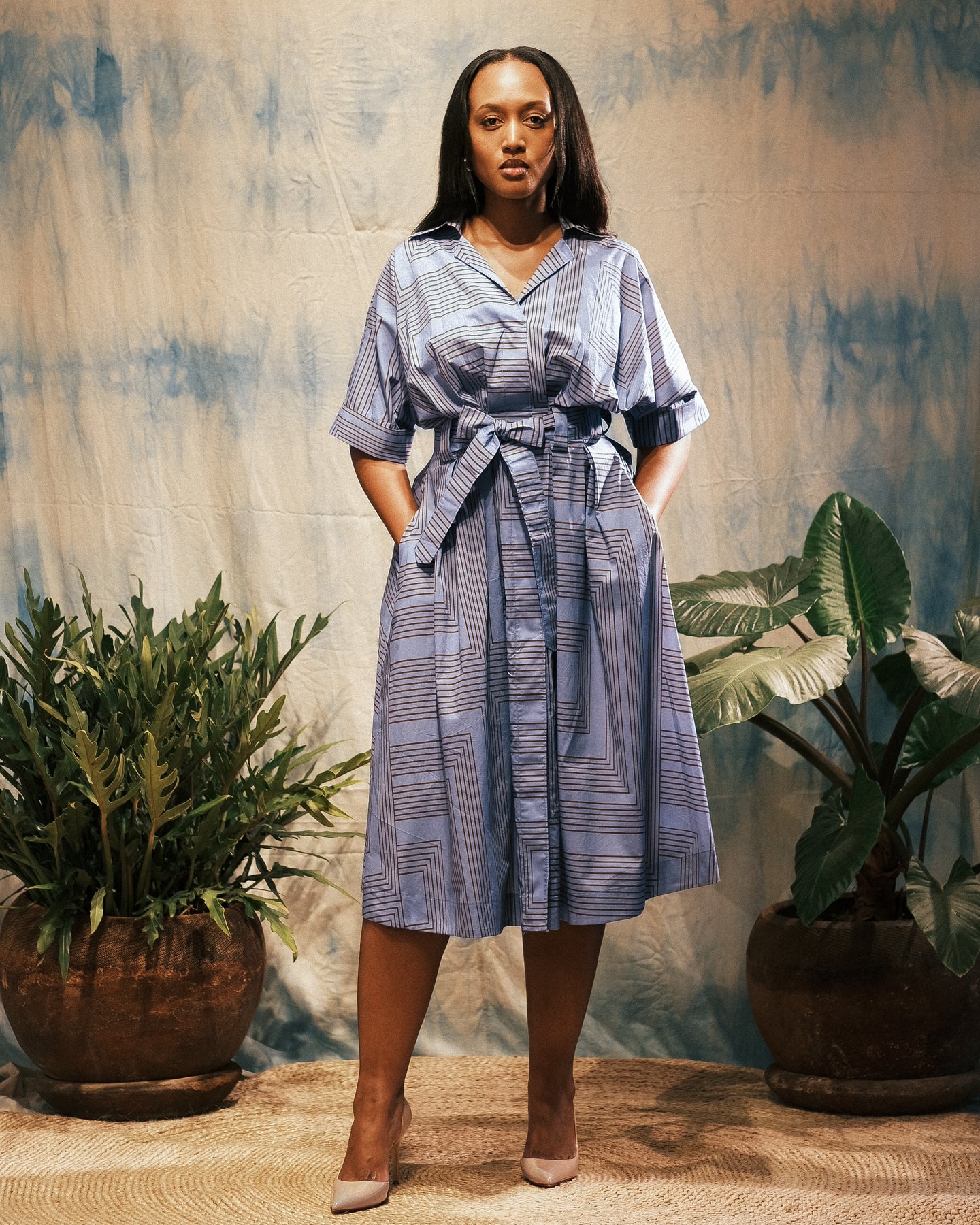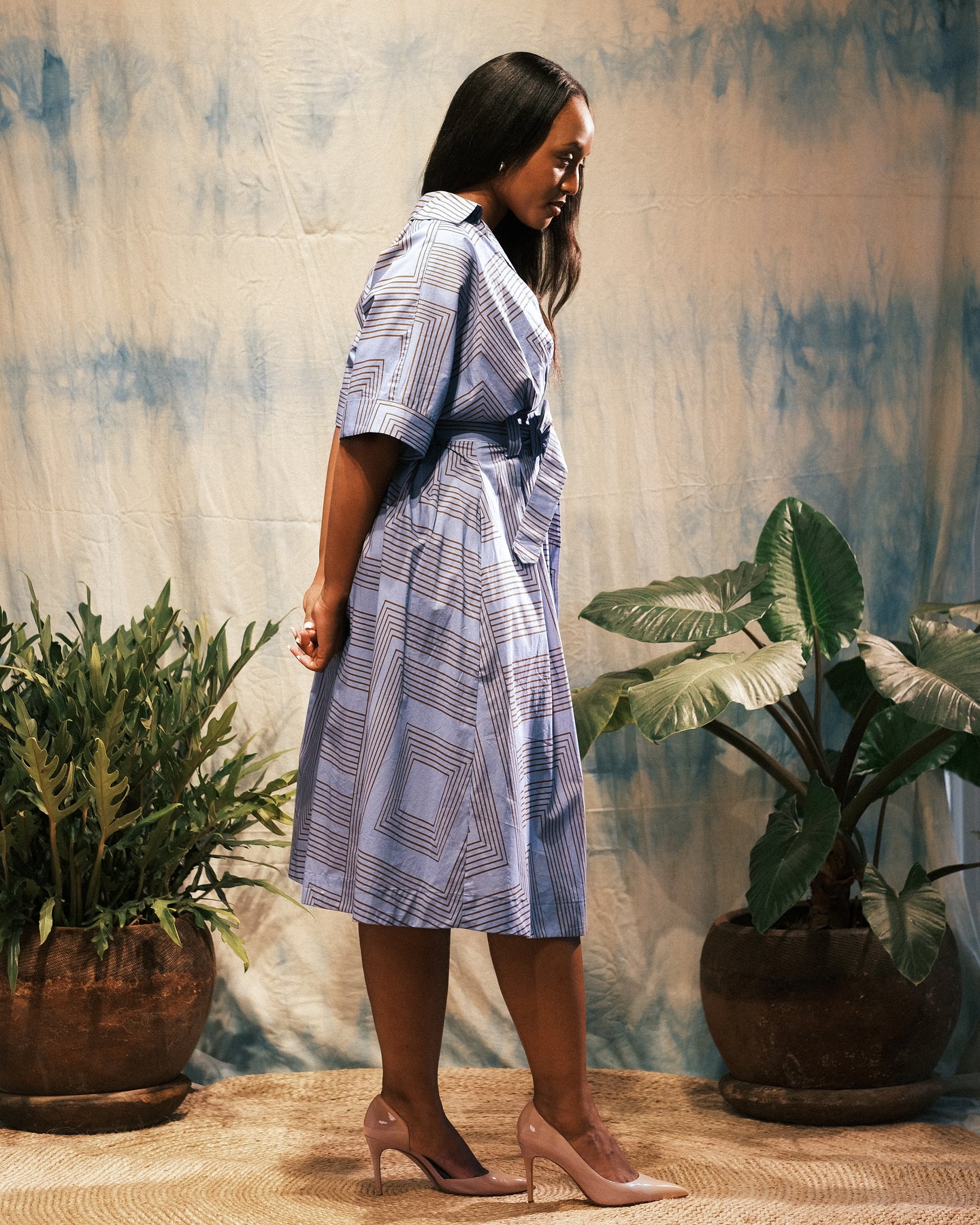A tailored cotton dress with softly structured sleeves, an accentuated waist, and an adjustable tie that shapes the silhouette with ease.